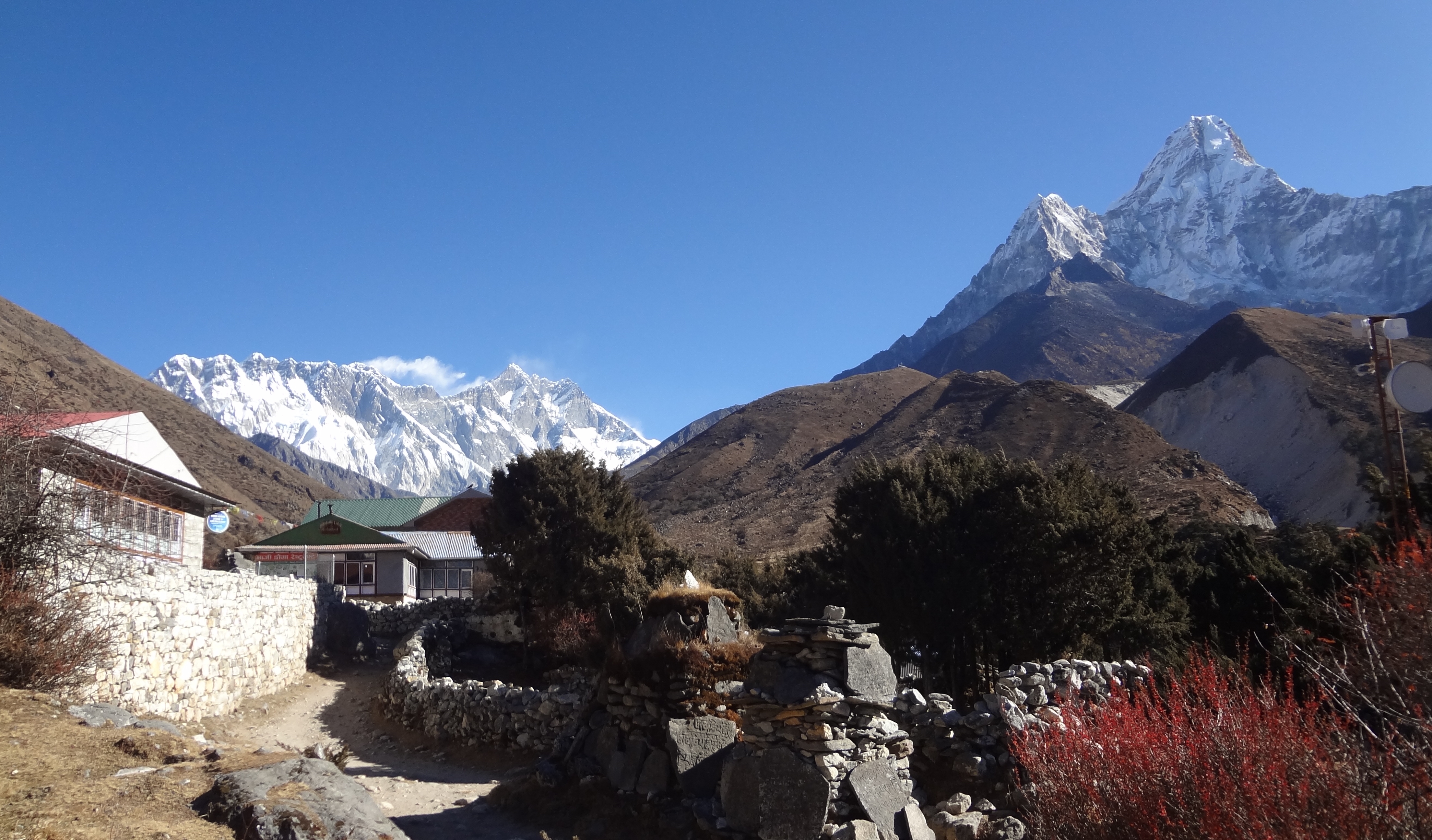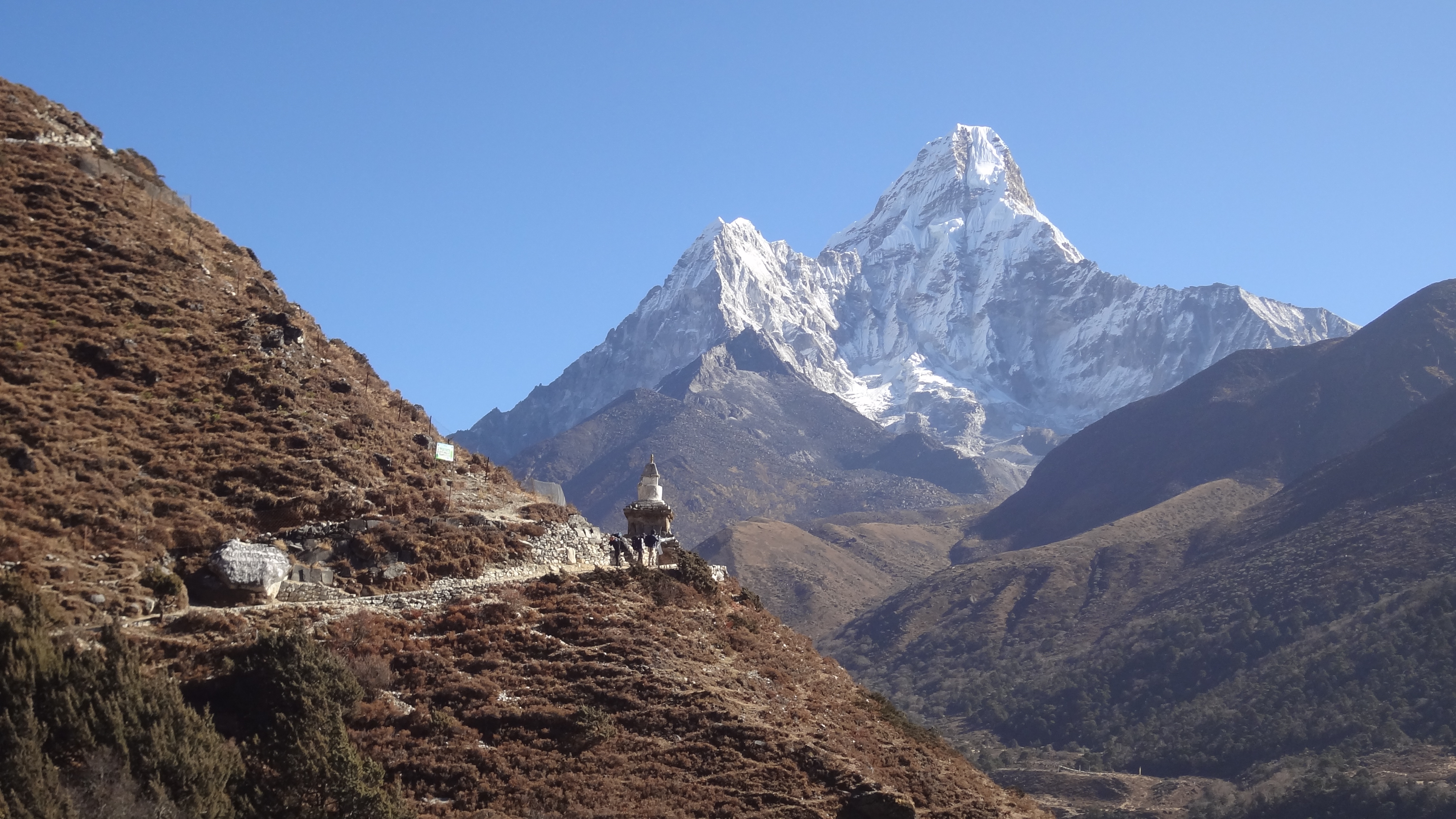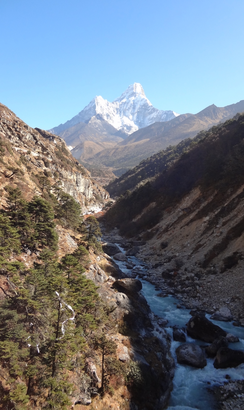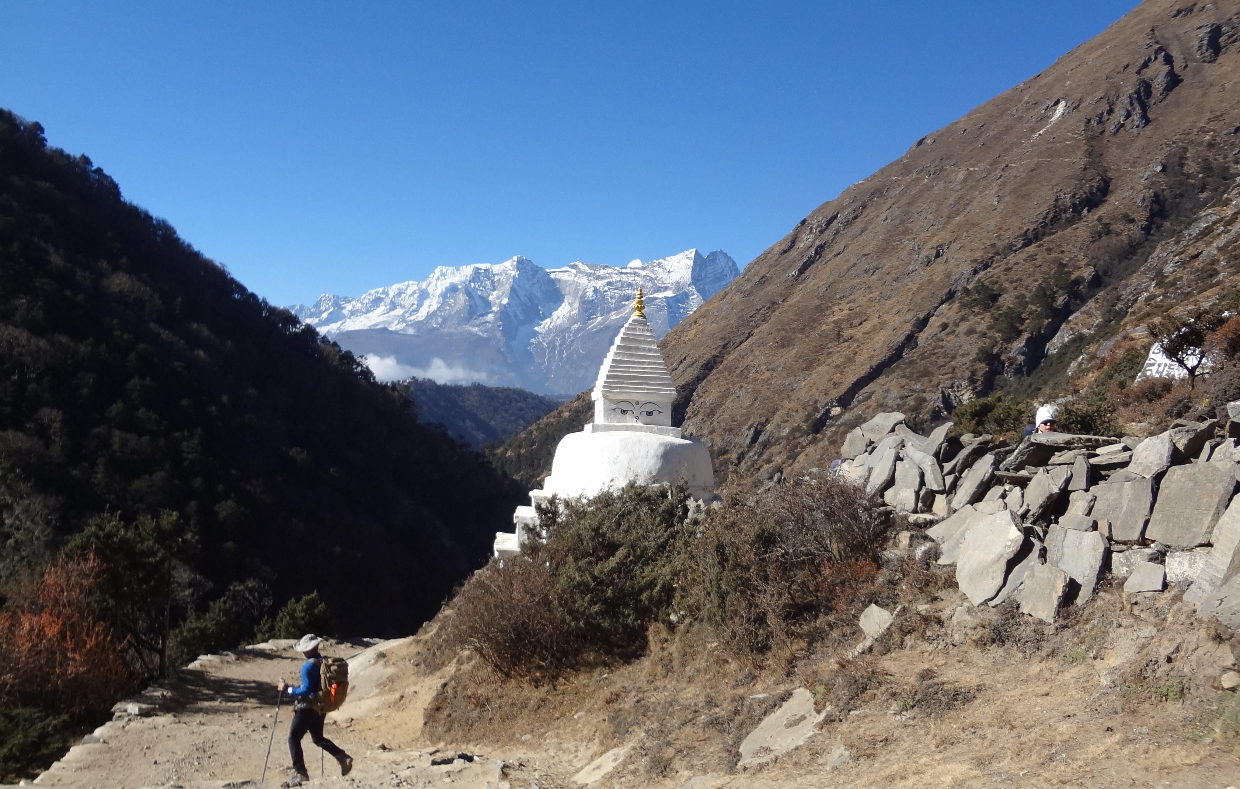 길에는 초르텐이 있고 계곡 끝에는 남체 건너편에 있는 콩데도 조망됩니다