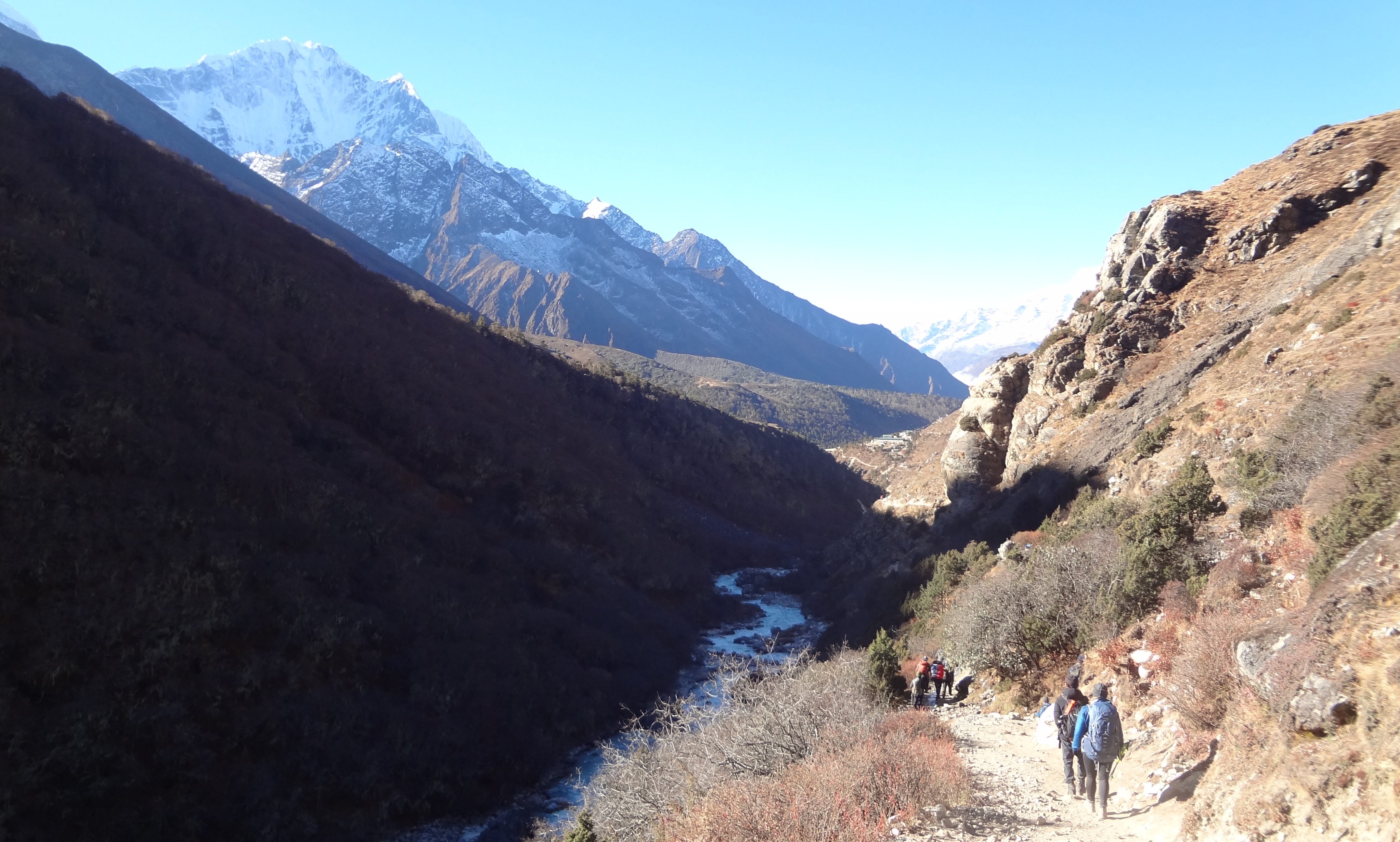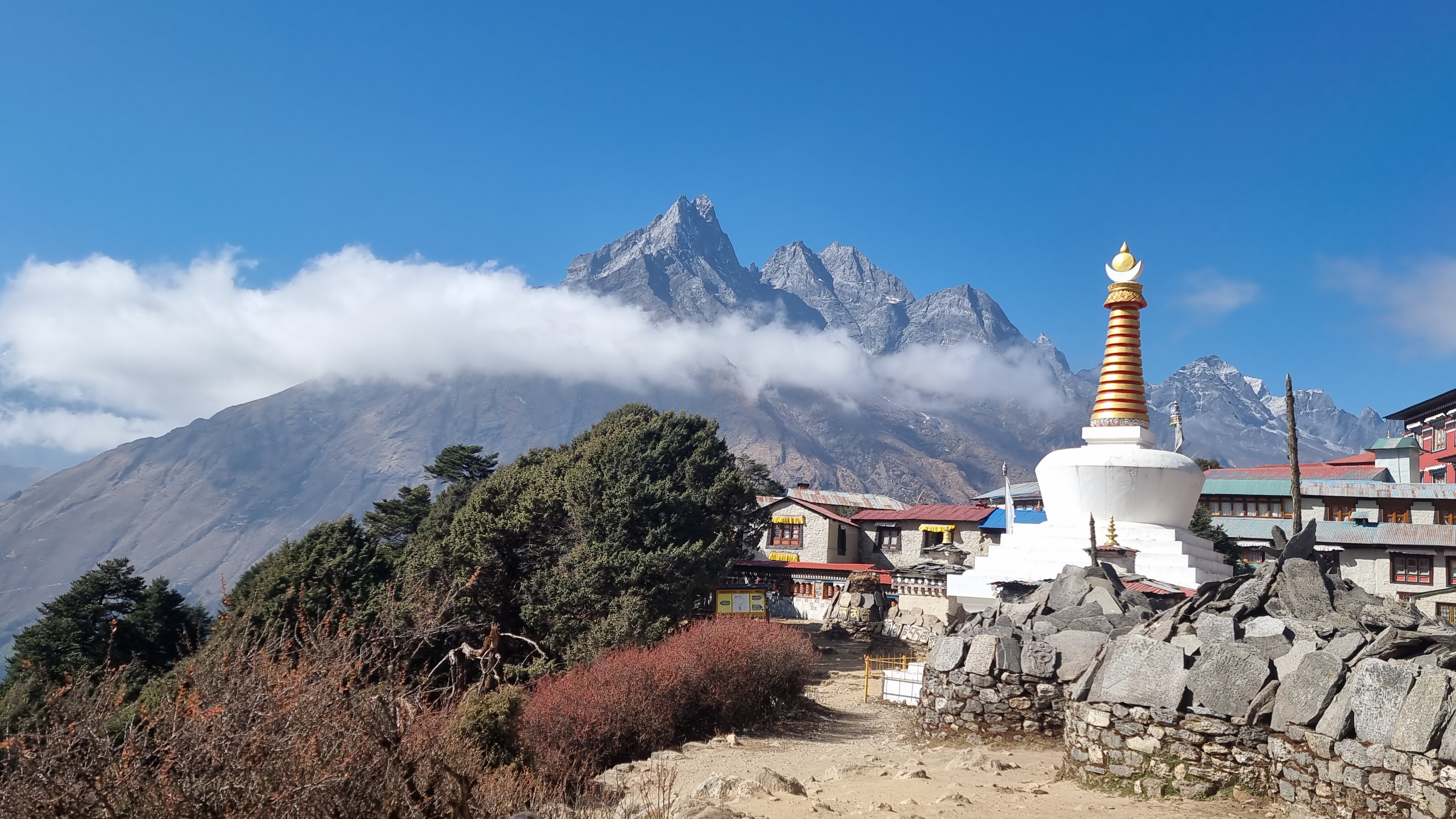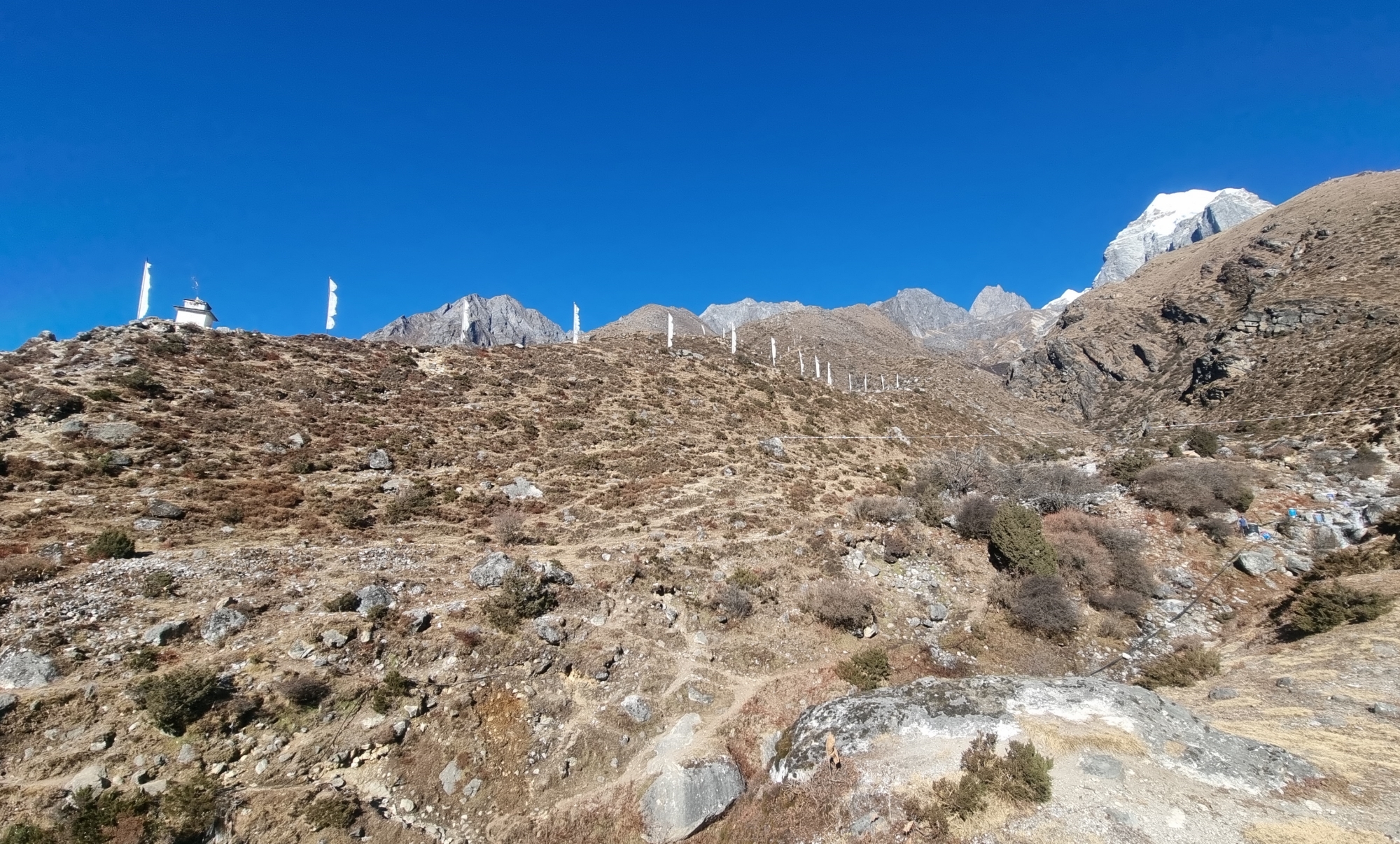 길에는 초르텐이 있고 계곡 끝에는 남체 건너편에 있는 콩데도 조망됩니다