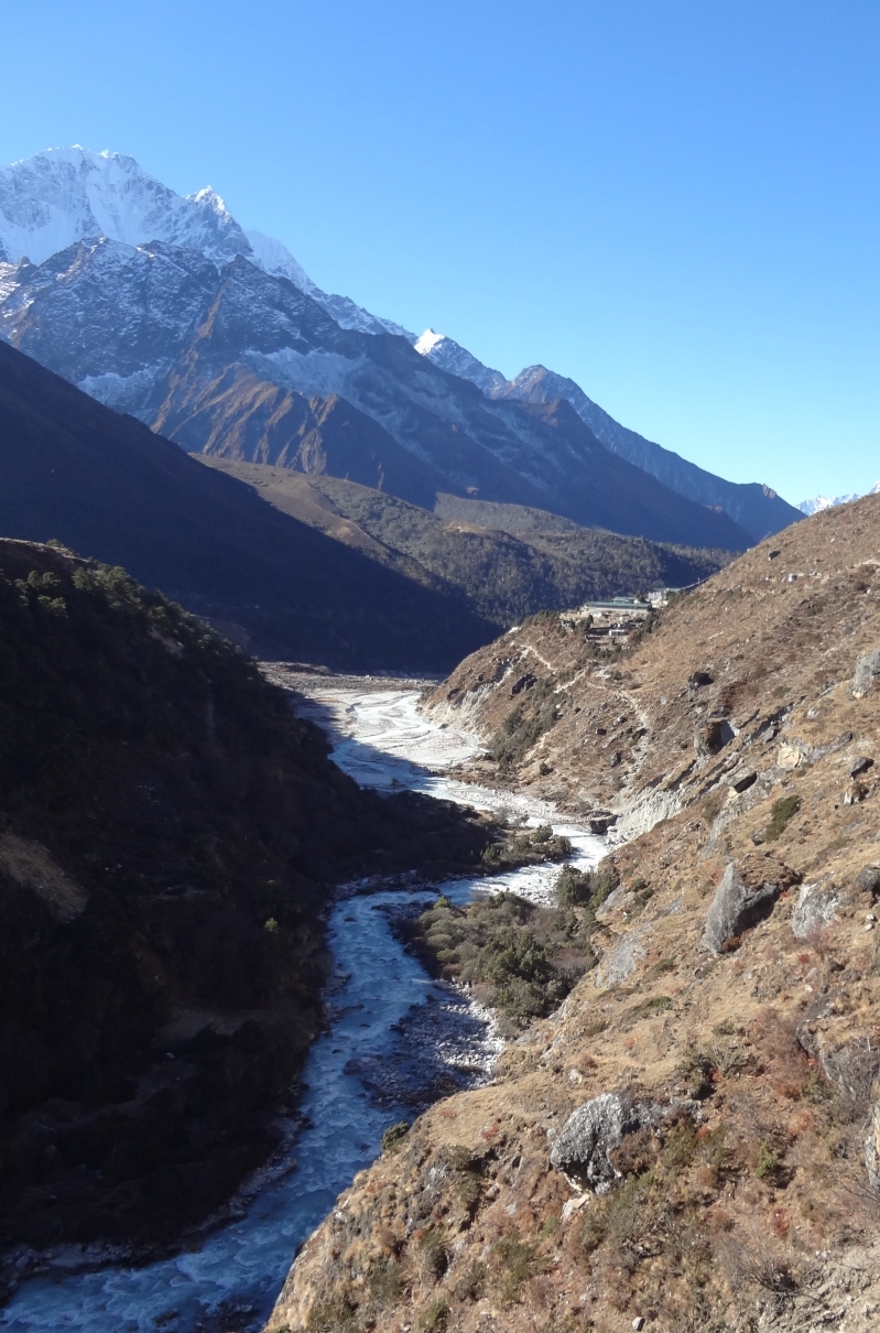 계곡사이 낮은 산(설산 앞)에는 뚝 떨어졌다 다시 올라 가야 하는 텡보체가 보입니다