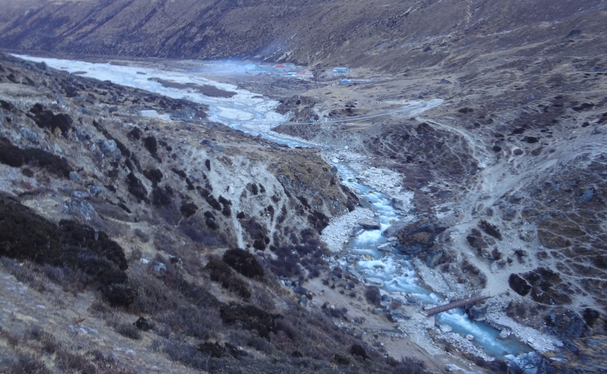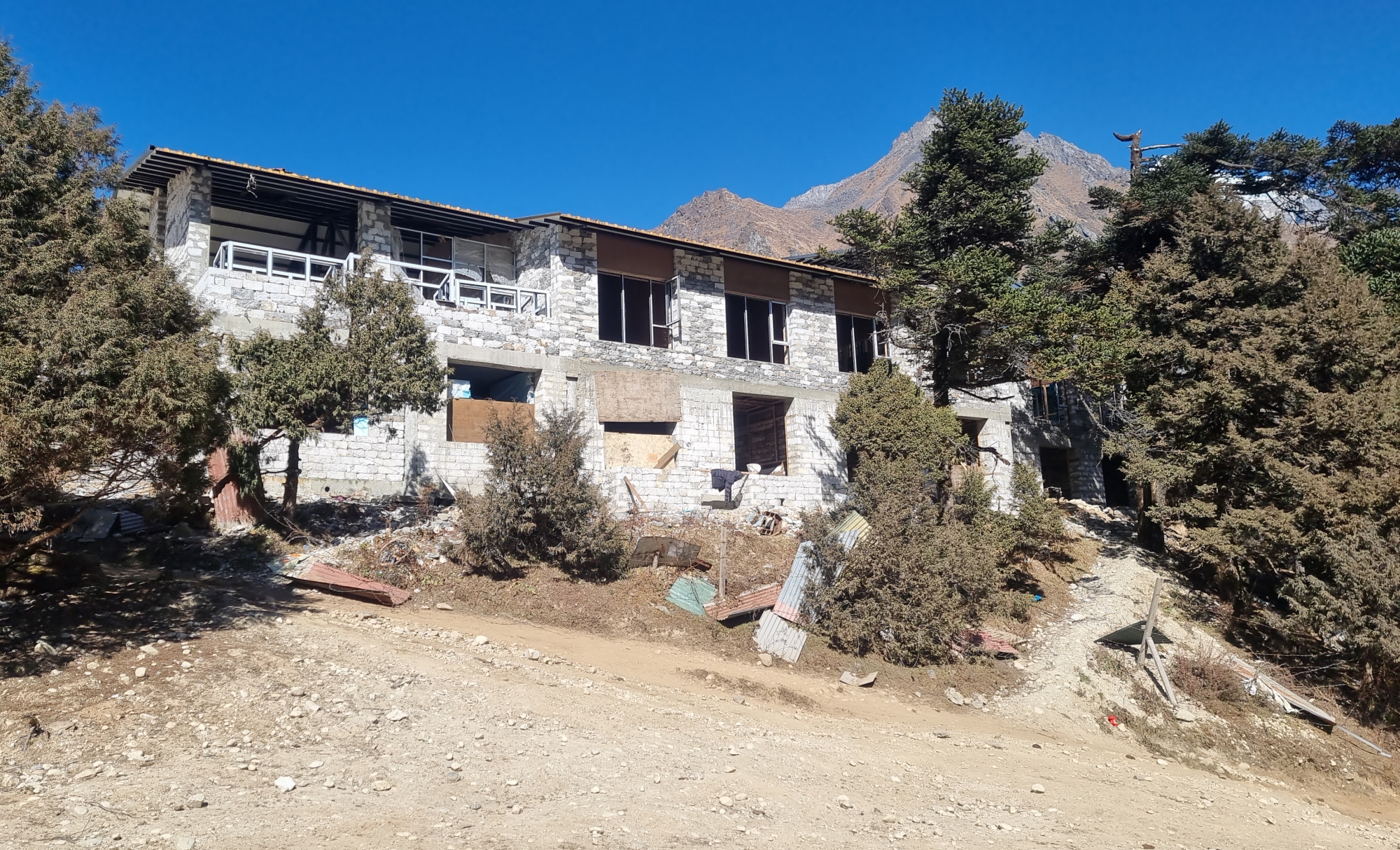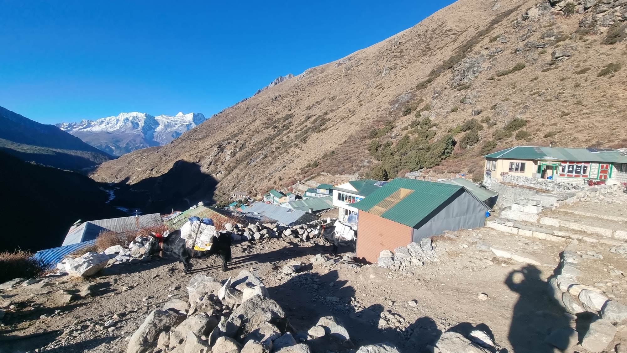 롯지 앞으로 난 아랫길은 딩보체로, 롯지 뒤로 이어지는 윗길은 투클라로 가는 길 입니다
