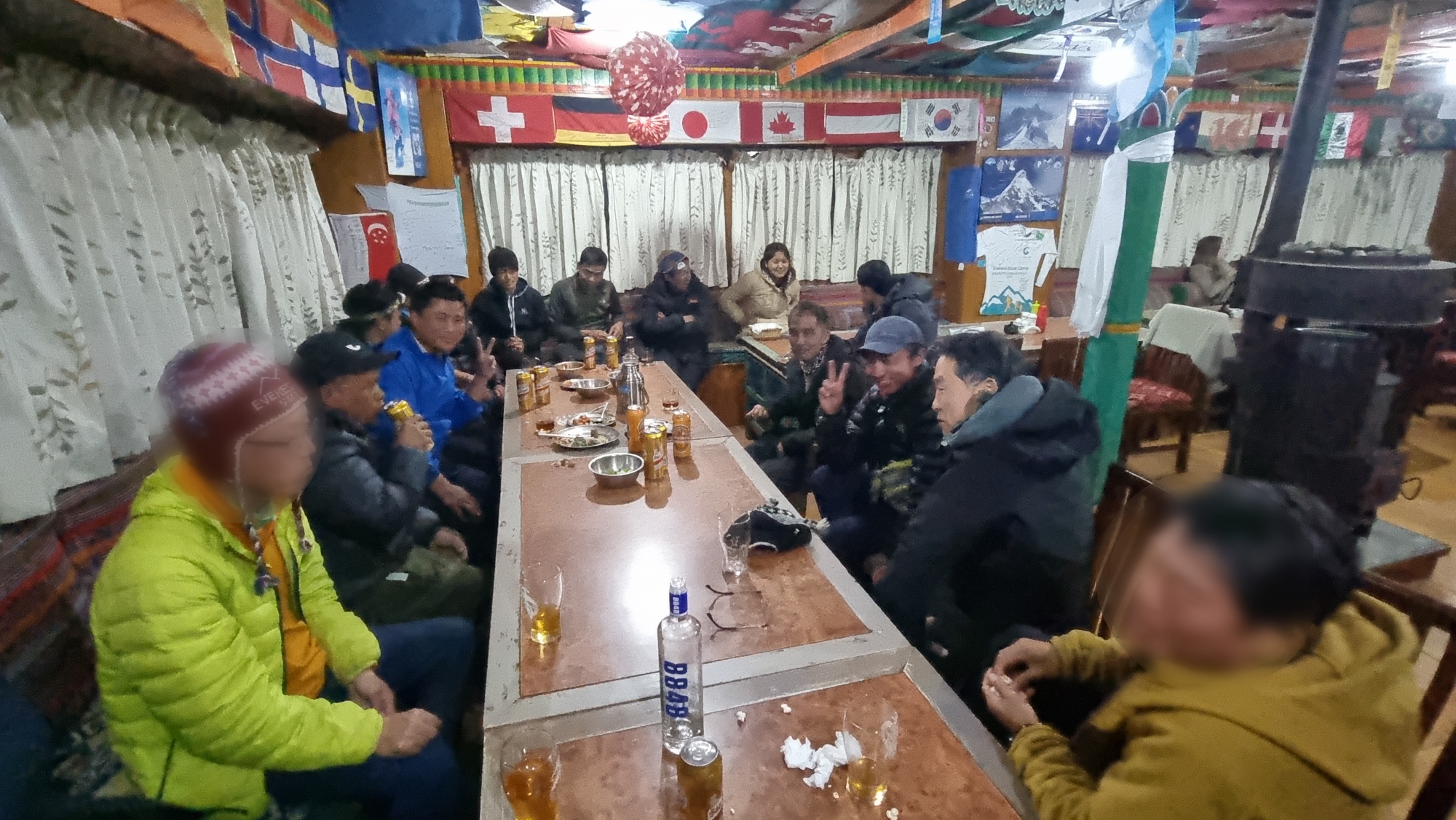 인솔자와 일행 3명과 함께 남아 고생한 셰르파들과 술한잔 하며