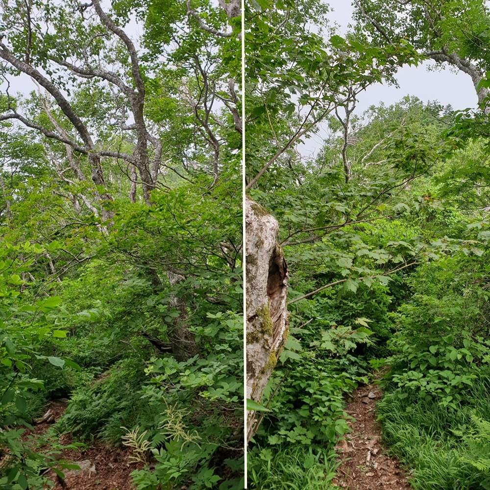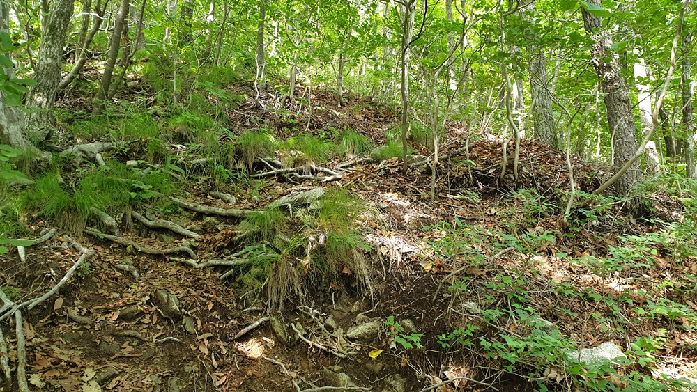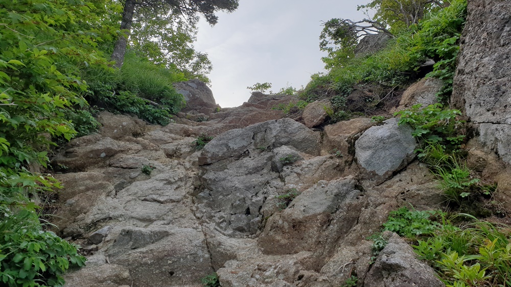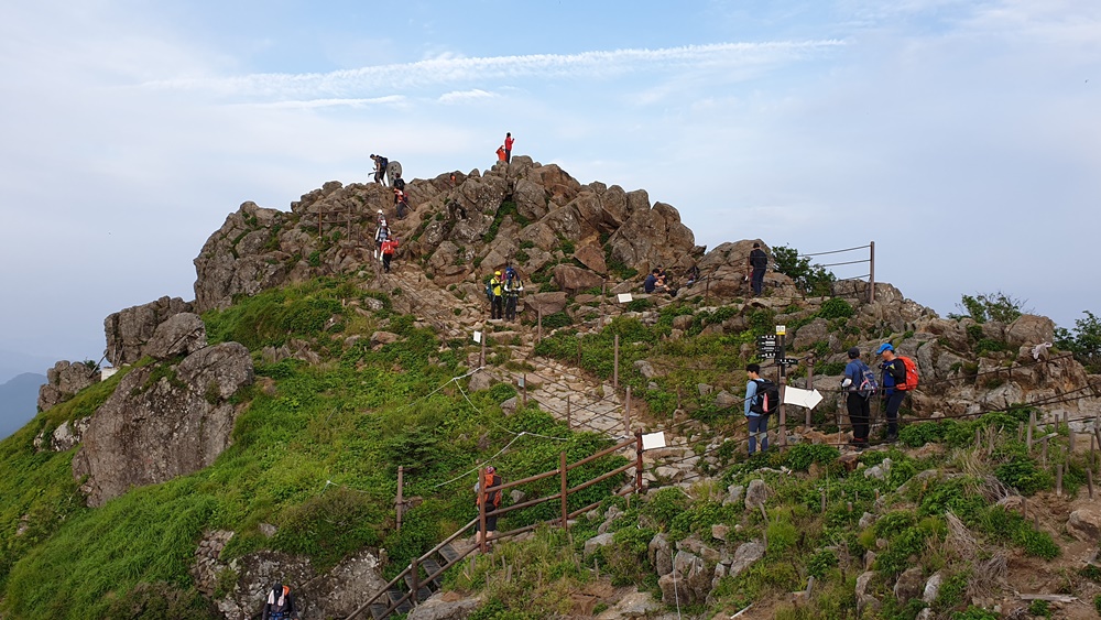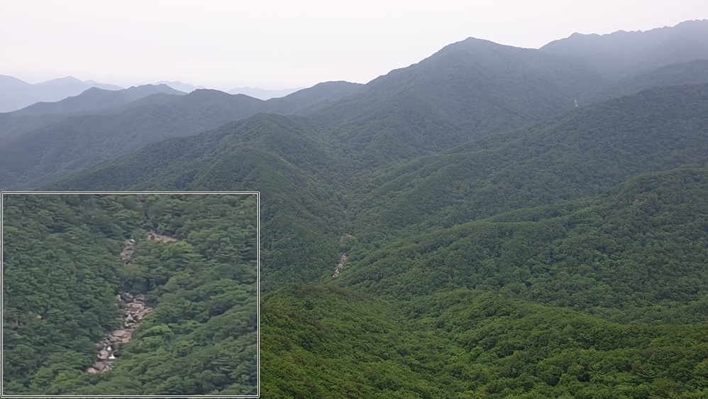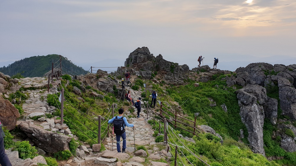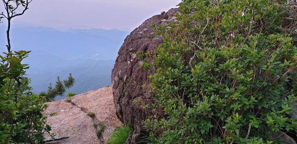 봉우리 사면을 따라 내려가는 길이 경사가 심하게 떨어져 내려갑니다