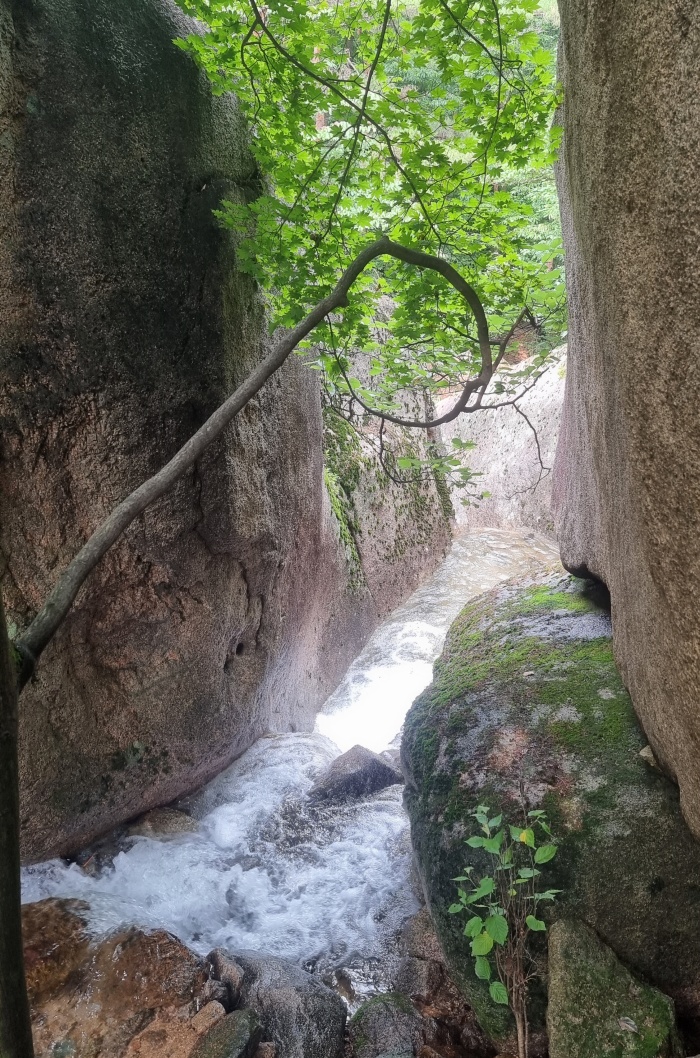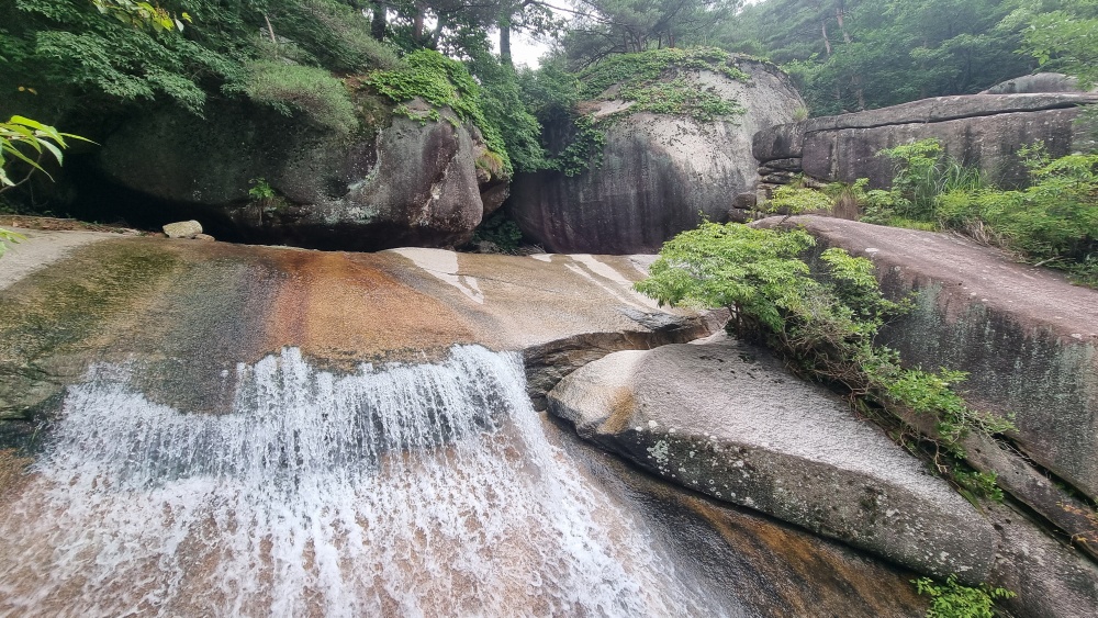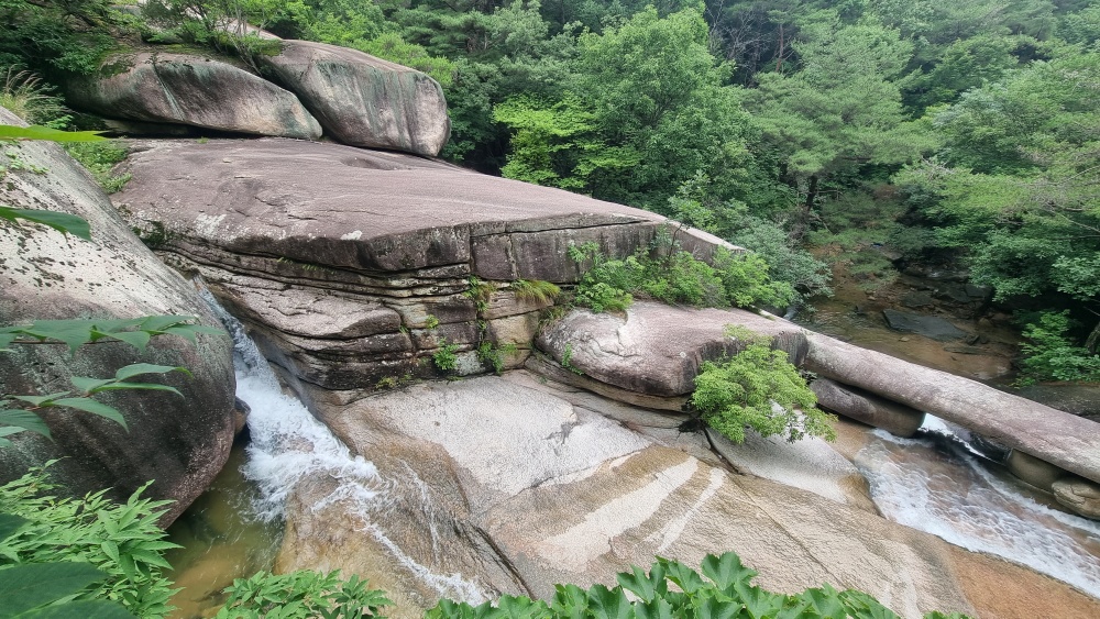 폭포수는 커다란 바위틈을 지나 흘러내려 갑니다