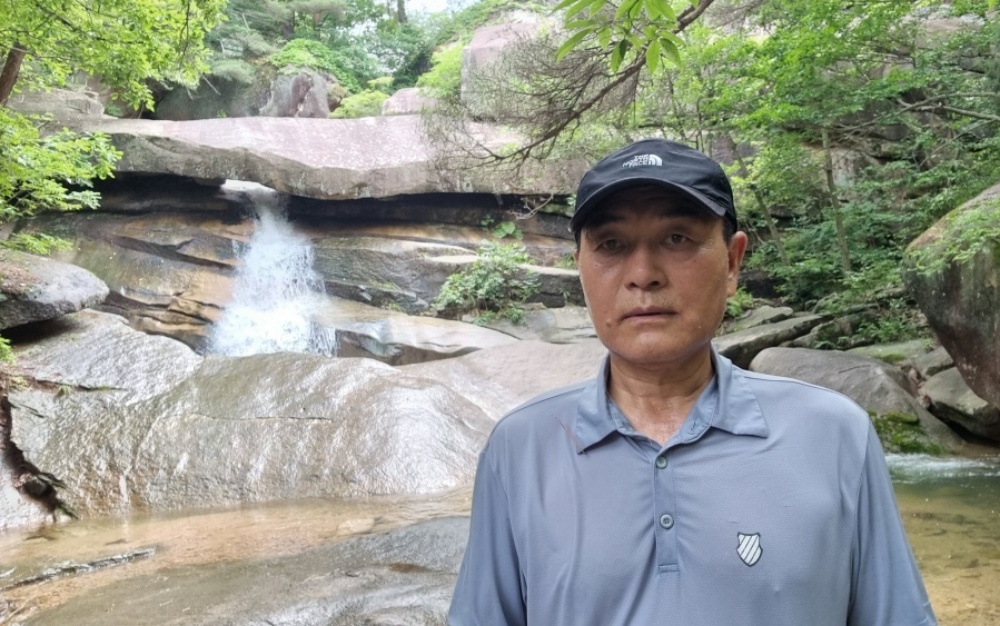 계단 좌측 난간 사이를 통과하여 바위에 서서 옥양폭포를 조망 합니다