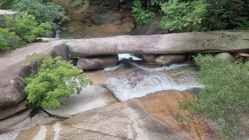 옥양폭포를 가르는 돌다리에 서서 상단에서 내려오는 폭포수를 내려다 보고 있자니