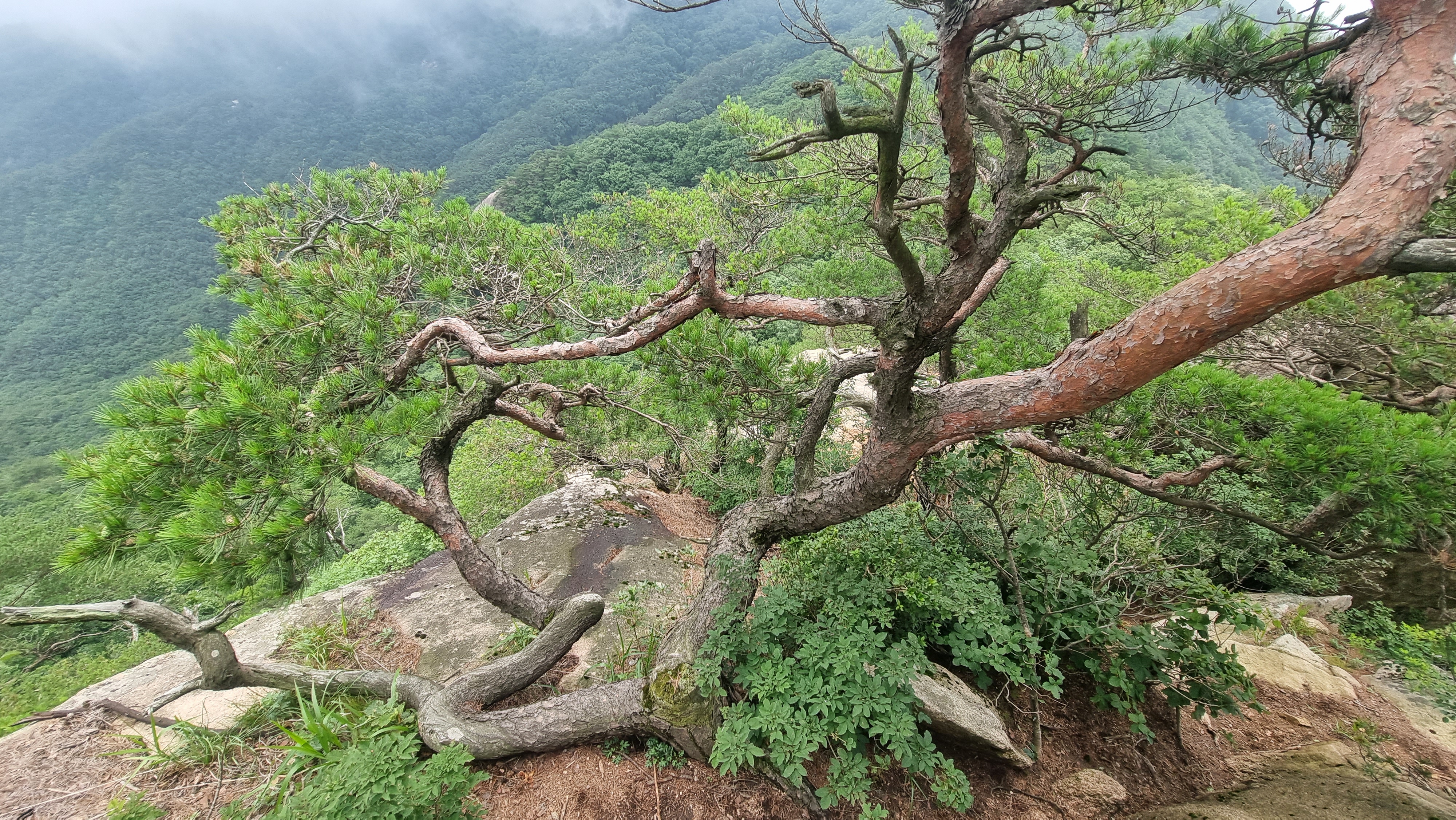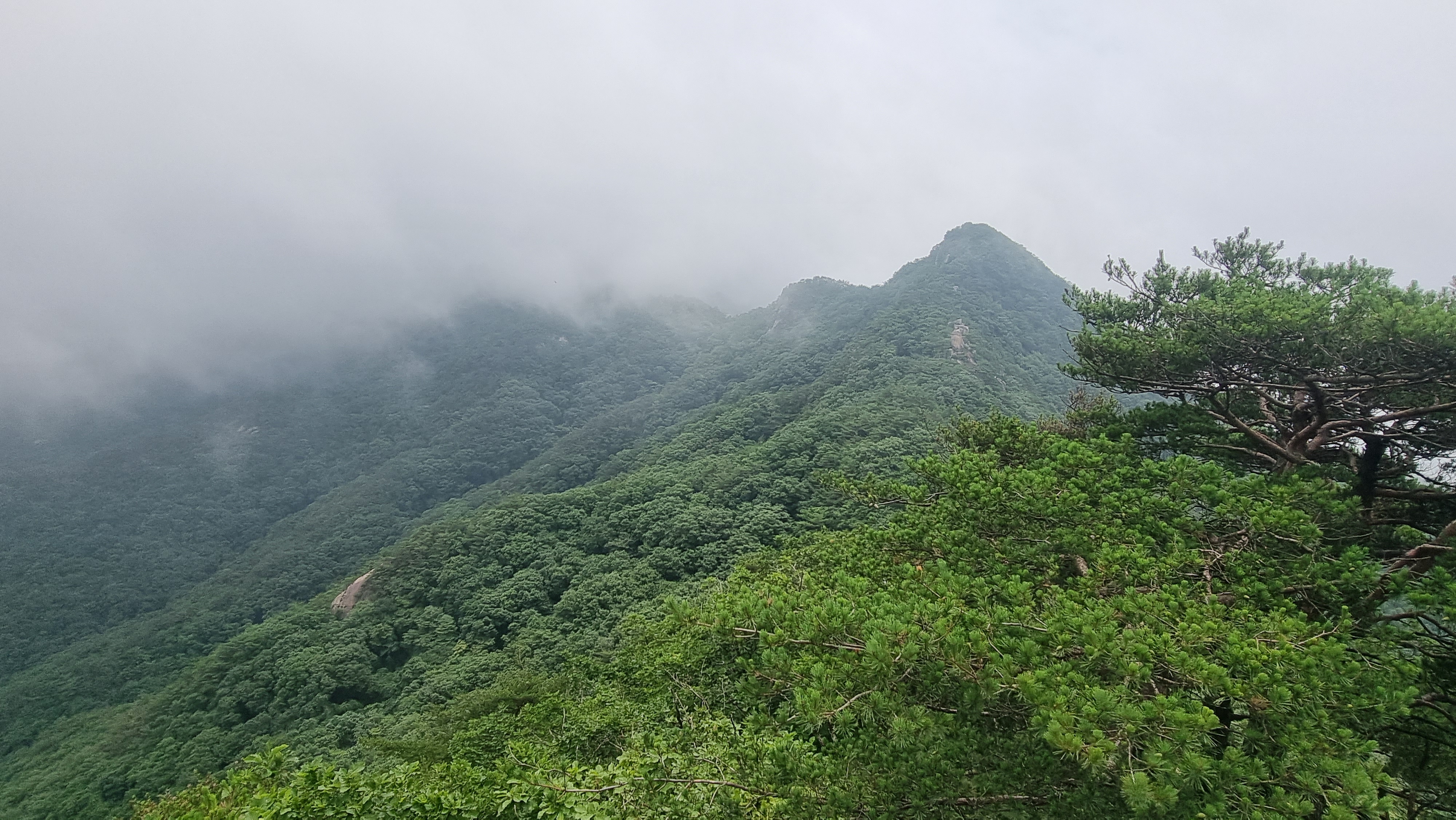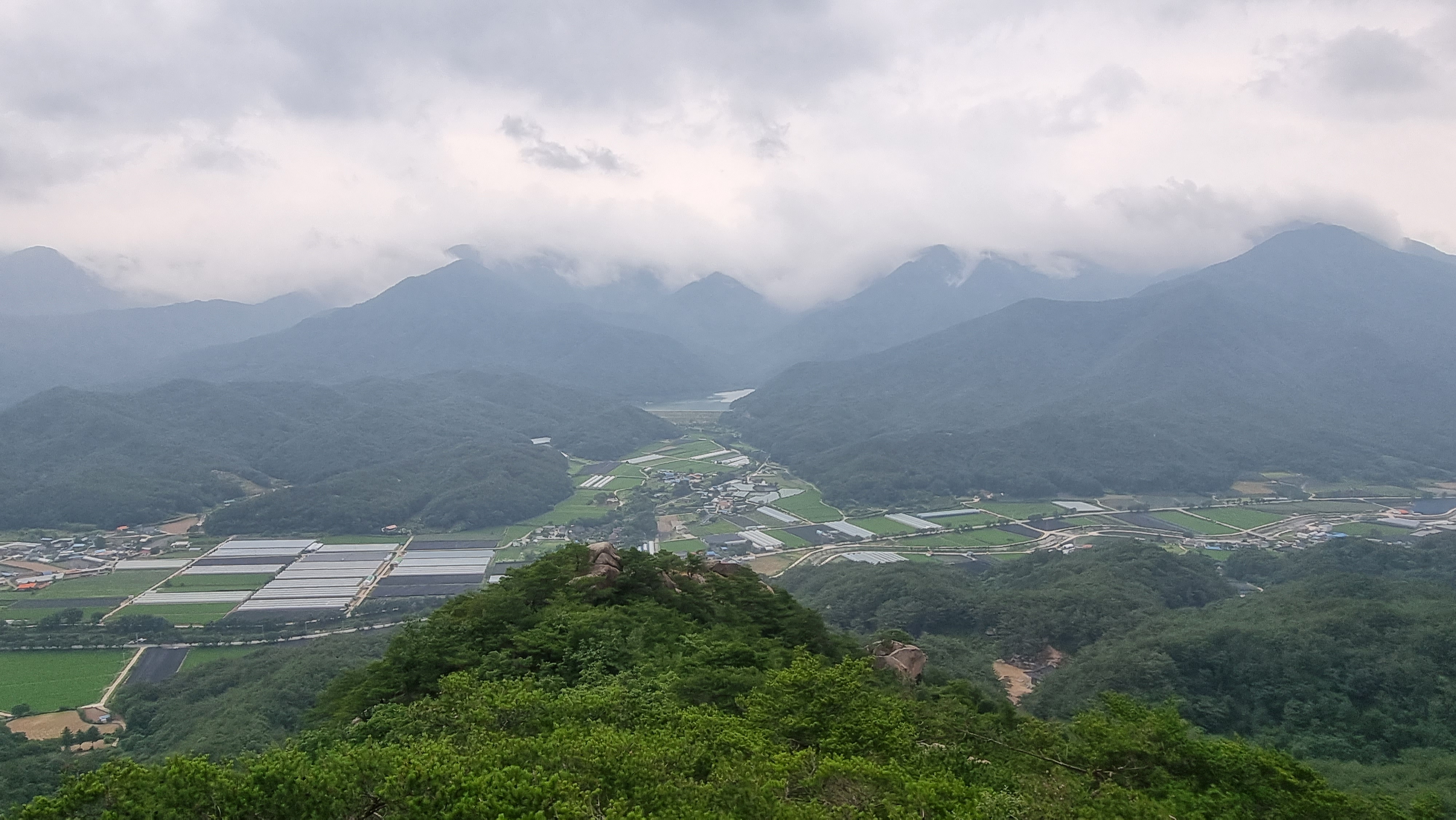 운해가 봉우리에 모자를 씌우고 계곡에 안긴 풍경이 아름다웠음