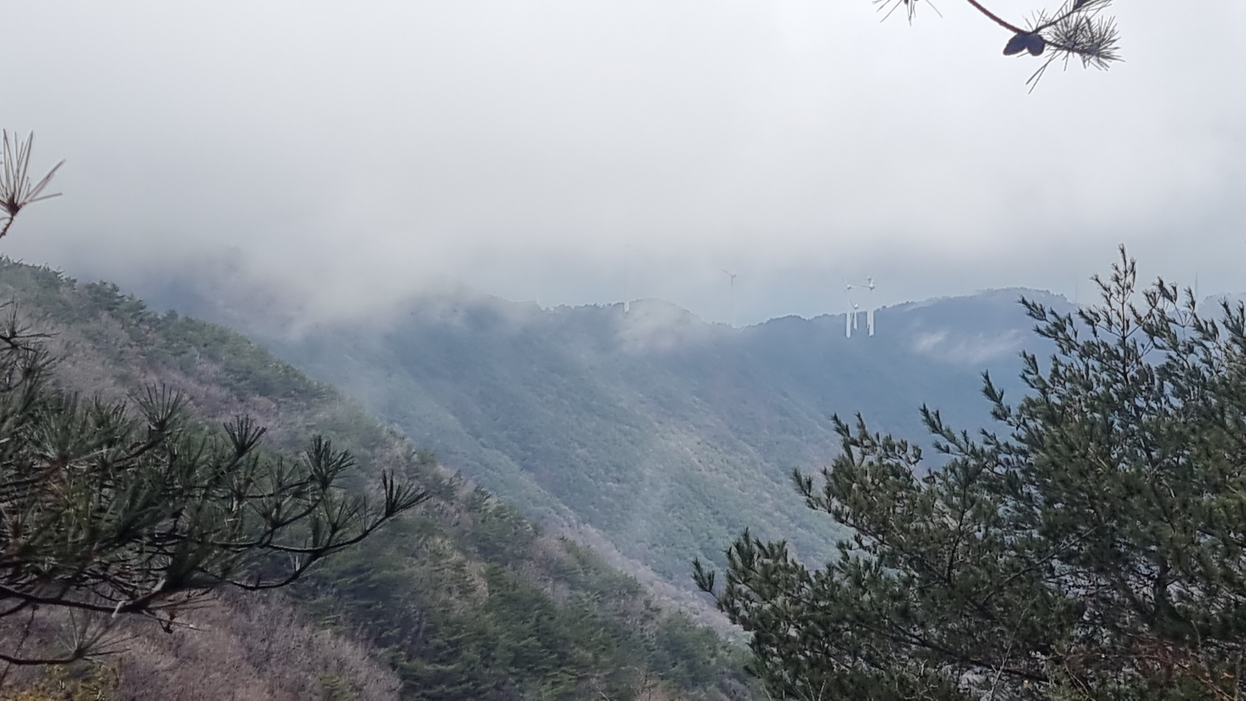 능선에 있는 풍력기가 운해속으로 숨었습니다